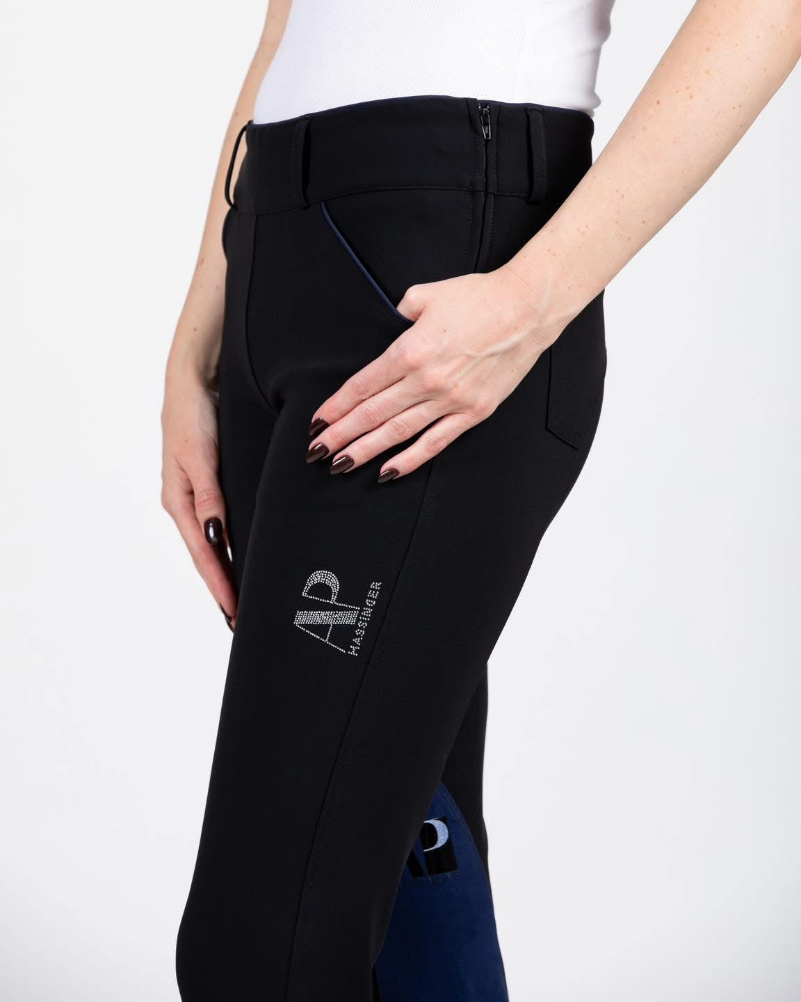 Experience an exceptional ride with our jumper breeches, exuding style and comfort. Our cutting-edge fabric adapts to your body for optimal comfort. The innovative knee patch fabric ensures superior grip and stabilization during flat work and jumping. The black piping accents on the pockets and waist create a sleek and refined appearance. Elevate your look with a rhinestone embellished logo on the left thigh. Two styles available - front zip or side zip!