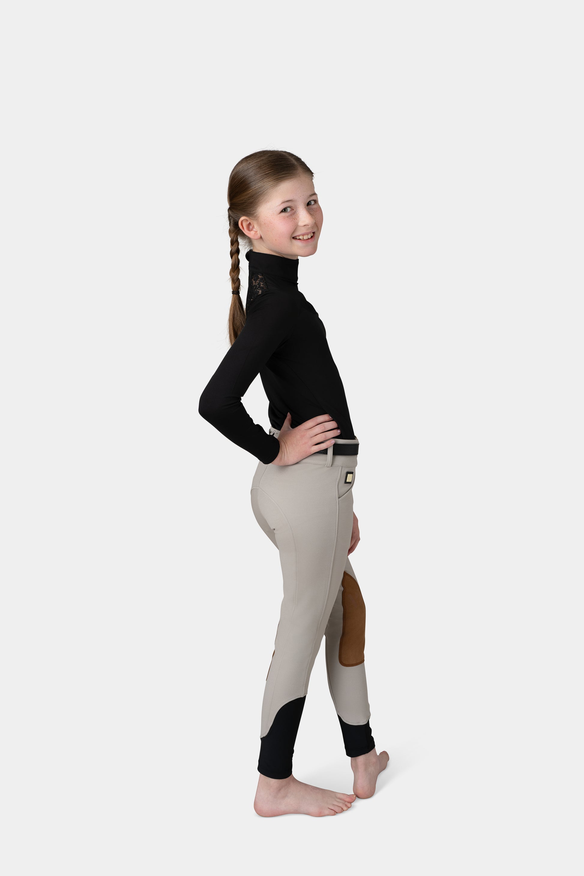 With its graceful high neckline and delicate flower lace inset, this shirt brings a touch of runway-inspired style to the barn. Crafted from lightweight, breathable, and moisture-wicking fabric, it keeps young riders cool and comfortable, while UPF-rated sun protection provides confidence in every season. The four-way stretch allows full freedom of movement, and thumbholes keep sleeves in place for a polished, secure fit.