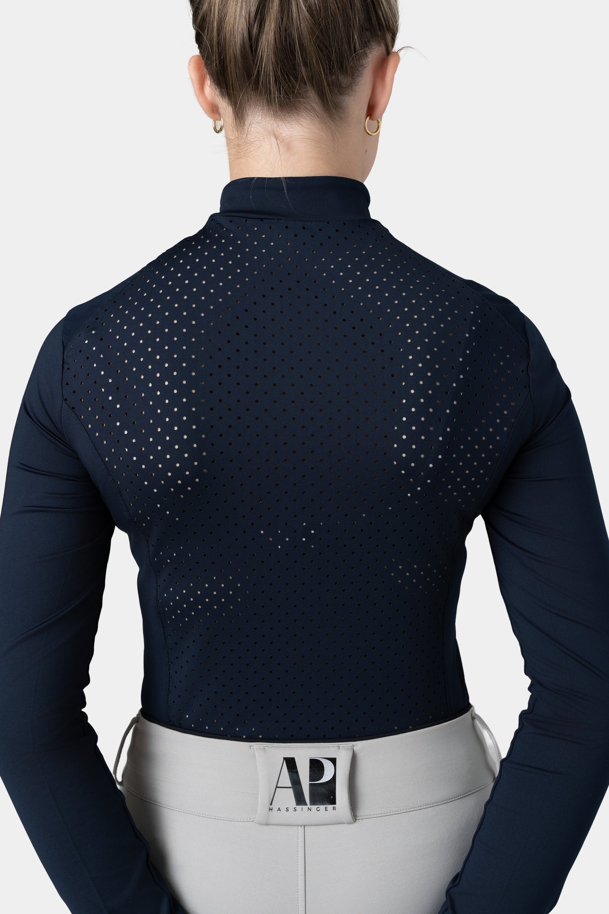 Where timeless elegance meets high-performance design. The Madison Ave Ladies Long Sleeve Sun Shirt is crafted for riders who want refined style without sacrificing function. Featuring a chic high collar and a striking lace inset, this top delivers a sophisticated, fashion-forward look perfect for both competition and everyday wear.